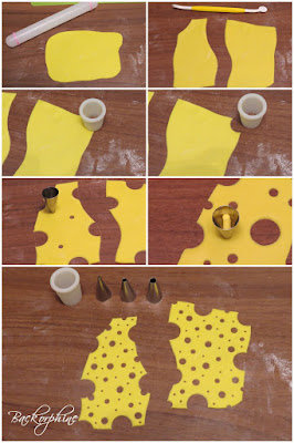 Alex würde jetzt sagen das sieht ja aus wie Käse...naja ok das tut es irgendwie ja auch. Ich würde euch also raten eine andere Farbe zu verwenden :). Für den "Käse" rollt ihr Fondant dünn aus und schneidet es mit dem Wheeltool zurecht. Dann verwendet ihr verschieden große Kreisausstecher oder Spritztüllen, um ein schwammartiges Muster zu erzeugen. Wenn ihr Spritztüllen verwendet, braucht ihr diese nicht nach jedem Löchlein zu säubern, sonder könnt einfach weitermachen. Die ausgestochenen Kreise verbinden sich nämlich zu einem Würstchen.